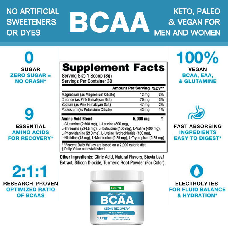 BCAA 파우더는 스포츠 영양 분야에서 매우 인기있는 보충제로서, 세 가지 필수 아미노산의 완벽한 조합을 이용합니다.발린 - 운동 성능을 향상시키는 데 필수적인 역할을합니다.신체적 회복을 촉진하고 건강을 유지합니다.