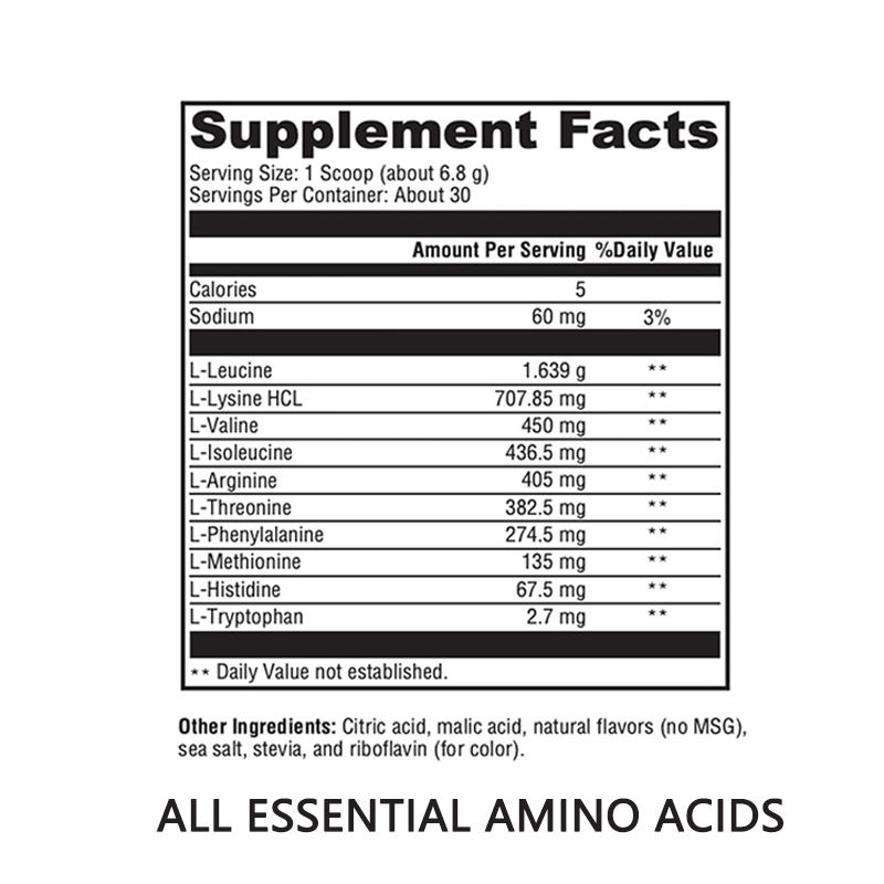 L-로이신, L-이소로이신, L-발린, L-라이신 HCL, L-아르기닌, L-트레오닌, L-페닐알라닌, L-메티오닌, L-히스티딘, L-트립토판