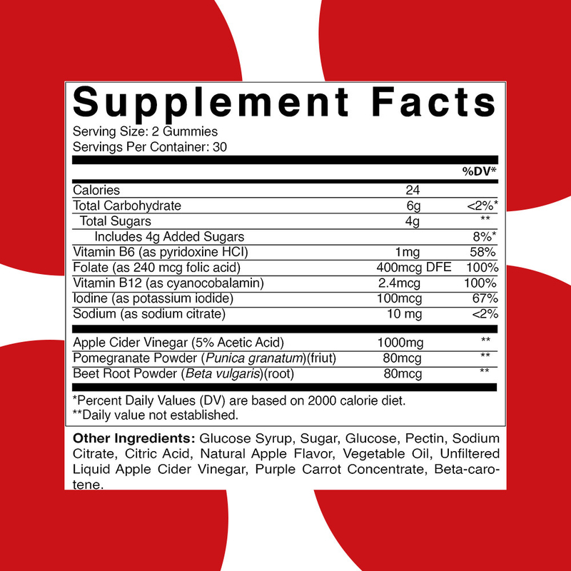 사과 사이다 식초, 비타민 B6, 엽산, 비타민 B12, 요오드, 나트륨, 석류 분말, 비트 뿌리 분말