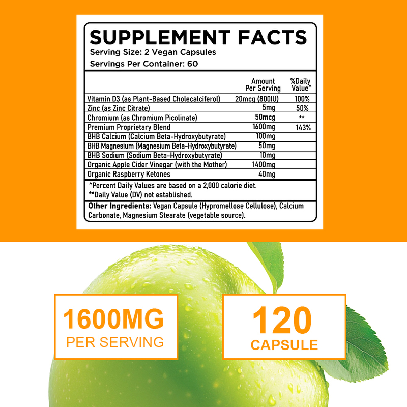 유기농 사과 사이다 식초, 비타민 D3, 아연, 크롬, 프리미엄 독점 블렌드, BHB 칼슘, BHB 마그네슘, BHB 나트륨, 유기농 라즈베리 케톤