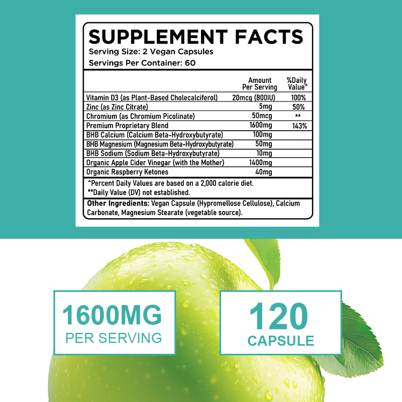 유기농 사과 사이다 식초, 비타민 D3, 아연, 크롬, 프리미엄 독점 블렌드, BHB 칼슘, BHB 마그네슘, BHB 나트륨, 유기농 라즈베리 케톤