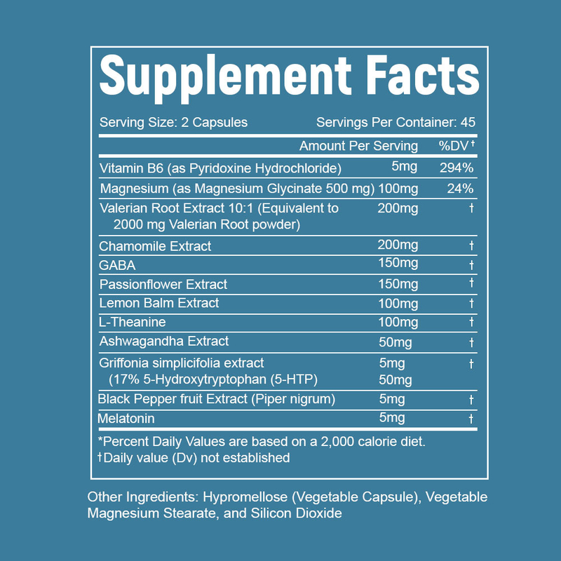 비타민 B6, 마그네슘, 발레리안 뿌리 추출물, 카모마일 추출물, GABA, 패션플라워 추출물, 레몬 밤 추출물, L-테아닌, 아슈와간다 추출물, 그리포니아 심플리시폴리아 추출물, 블랙 페퍼 열매 추출물, 멜라토닌
