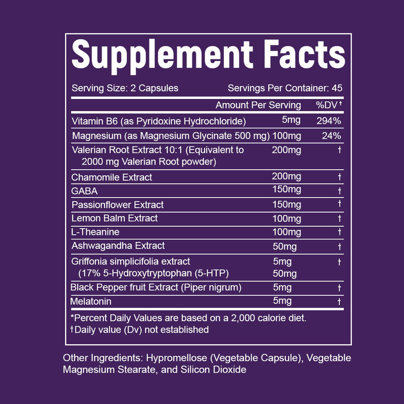 비타민 B6, 마그네슘, 발레리아나 뿌리 추출물, 카모마일 추출물, GABA, 열정꽃 추출물, 레몬 블램 추출물,검은 후추 과일 추출물멜라토닌