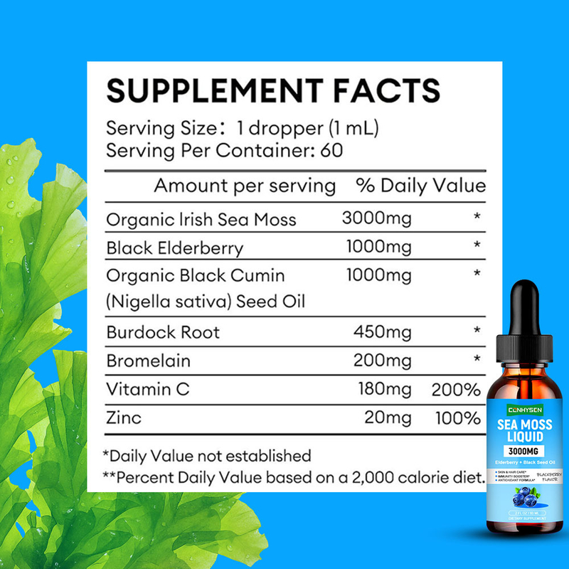 유기농 아일랜드 바다 모스, 비타민 C, 블랙 엘더베리, 버드크 뿌리, 유기농 블랙 큐민, 브로멜레인, 아연